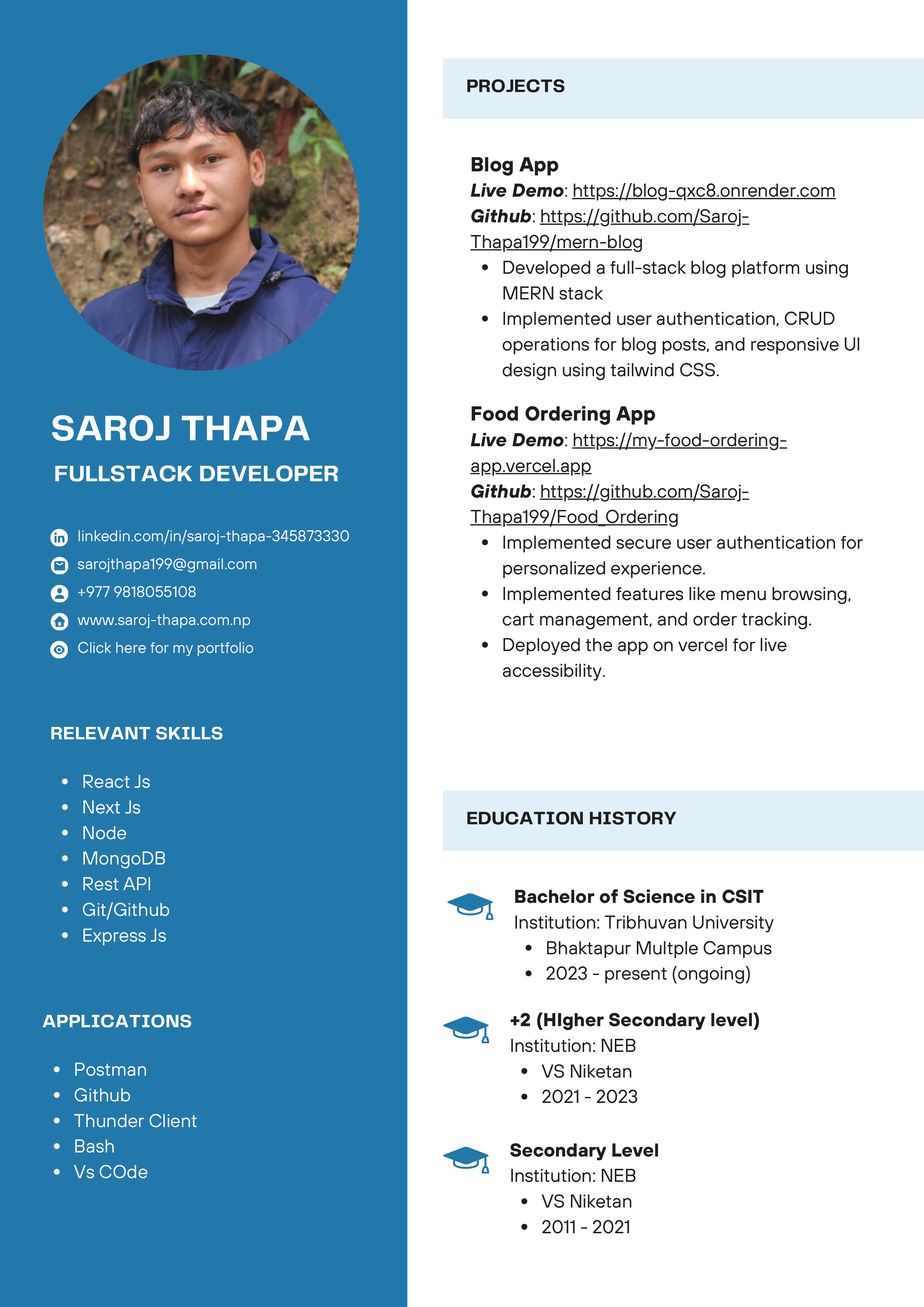 Hi! I'm Saroj Thapa, a full-stack developer specializing in the MERN stack. I love bringing ideas to life by building dynamic and user-friendly web applications.